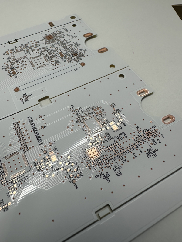 両面基板は、スルーホールを介して基板の表裏を接続し、配線を立体的に構成できる基板です。FR-4、FR-5相当、ハロゲンフリーFR-4など、様々な材料厚みや銅はく厚み、材料型番を常備しています。